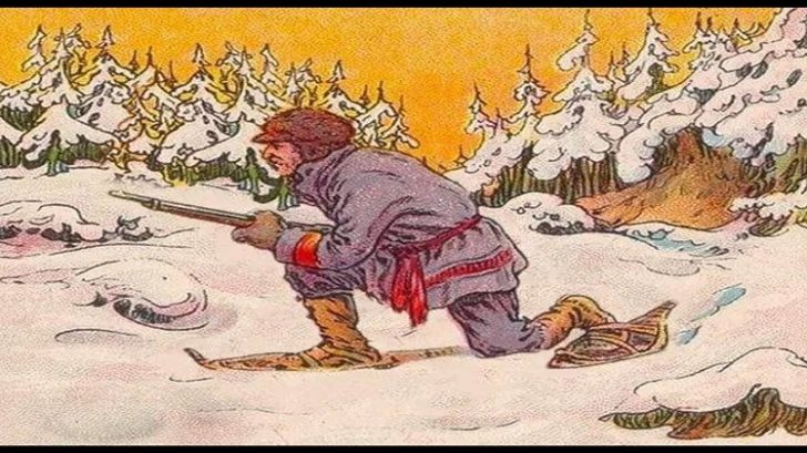 पुरानी कलाकृति में एक शिकारी को दिखाया गया है, जो अपने घुटनों पर झुकता है और हाथ में बंदूक रखता है, जिससे यह आभास होता है कि वह बर्फ से ढके जंगल में एक लक्ष्य की तलाश कर रहा है। आपको यह विश्वास दिलाने के लिए छल कर सकता है कि कोई भालू नहीं है, लेकिन वास्तव में पृष्ठभूमि में कहीं न कहीं एक बड़ा भूरा भालू है।