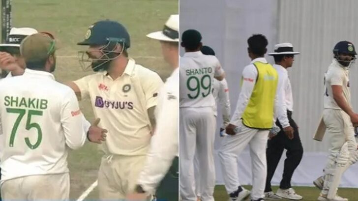 तीसरे दिन की समाप्ति से पहले विराट कोहली का विकेट गिरने पर मैदान पर विवाद खड़ा हो गया। विराट कोहली के आउट होने के बाद बांग्लादेशी खिलाड़ी से विवाद हो गया। और हालात ये बने कि शाकिब अल हसन को बचाने के लिए आगे आना पड़ा. दूसरे टेस्ट की दूसरी पारी में विराट कोहली सिर्फ 1 रन बनाकर आउट हो गए। मेहदी हसन मिराज की गेंद पर मोमिनुल हसन ने विराट कोहली को कैच थमाया। विराट कोहली के आउट होते ही बांग्लादेशी खिलाड़ी खुशी से झूम उठे.