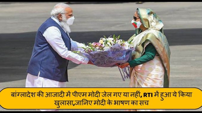 इस साल मार्च में अपनी ढाका यात्रा के दौरान, पीएम मोदी ने दावा किया कि उन्होंने और उनके सहयोगियों ने बांग्लादेश की स्वतंत्रता के लिए आंदोलन किया था और यहां तक कि जेल भी गए थे। पीएम मोदी ने कहा कि तब वह 20-22 साल के होंगे। विपक्षी नेताओं ने संकट में घिरे पीएम से इस्तीफे की मांग की। हालांकि, अब पीएम मोदी के दावे का सबूत मांगने के लिए एक आरटीआई दायर की गई है। इस संबंध में पीएमओ का कहना है कि प्रधानमंत्री के कार्यकाल की जानकारी कोई भी दे सकता है.